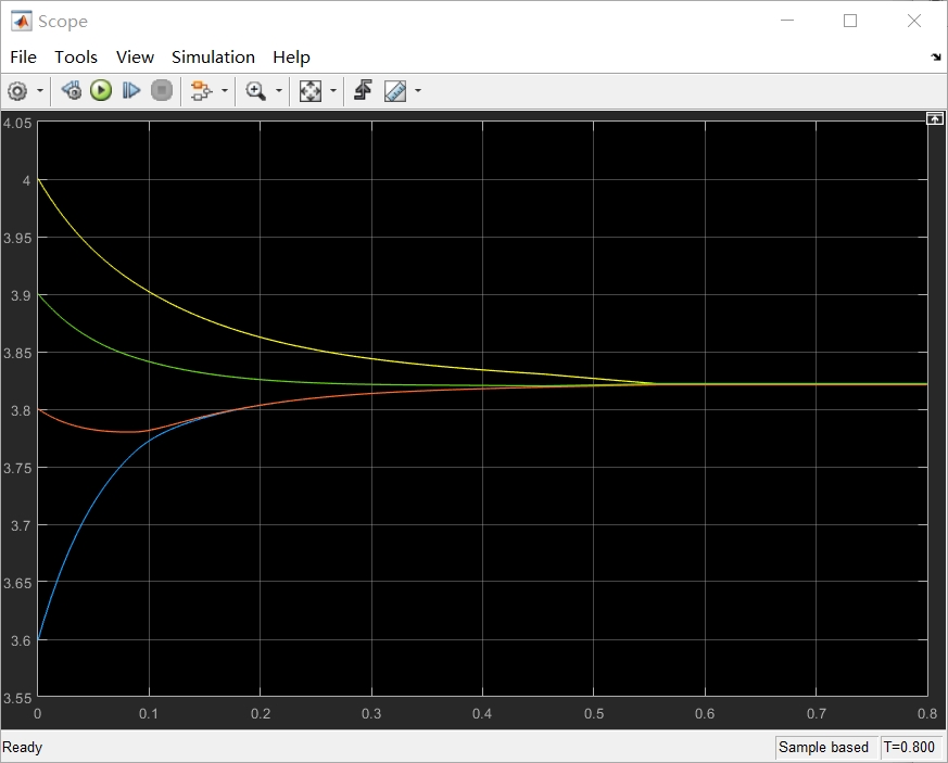 代码分析:这段代码很简单,定义了一个包含四节电池初始电压的数组battery_voltages,然后使用disp函数将这些电压值显示出来。从这里我们可以看到每节电池一开始的"状态",方便后续观察均衡电路的作用。