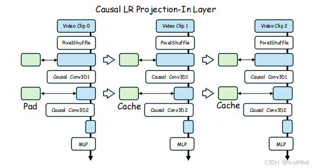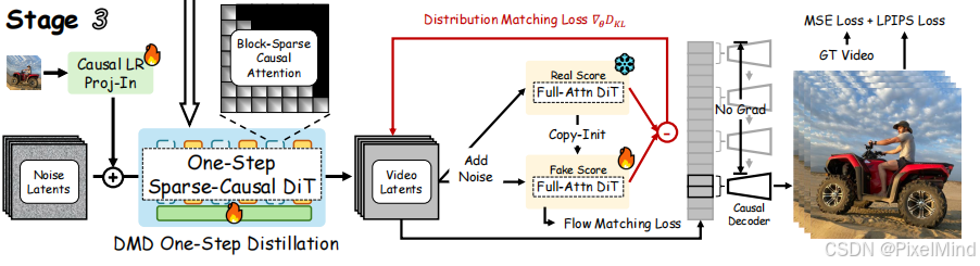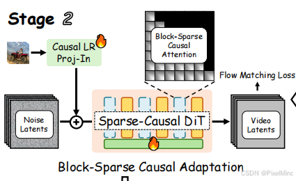这一步引入了Sparse-Causal DiT将阶段1的全注意力DiT替换掉。其中,因果mask将每个latent的参考范围限制在当前和过去的位置。也将阶段1的LR投影层(Proj-In)改为因果版本。