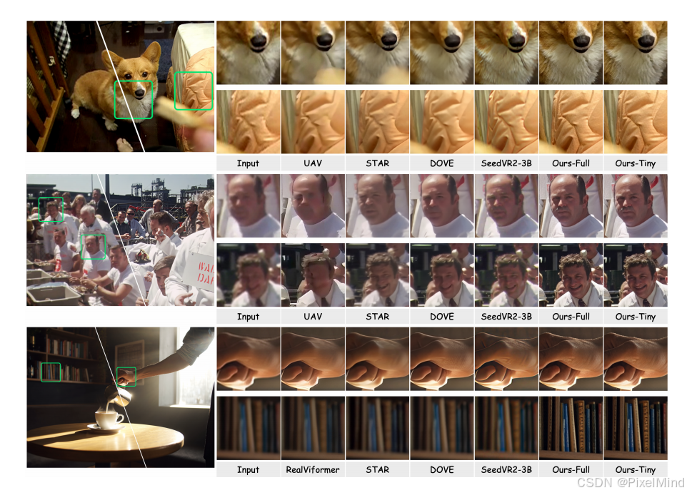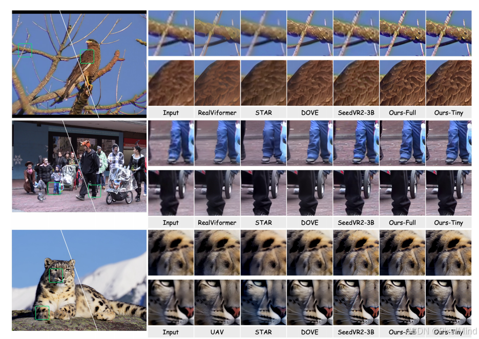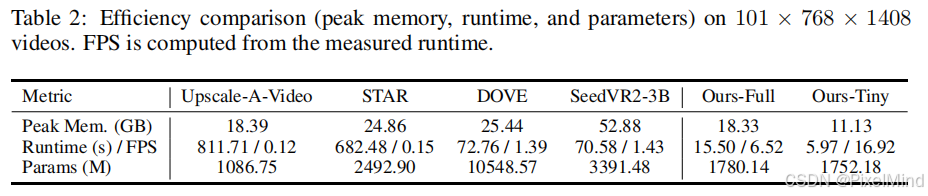 - 对比方法:包括非扩散模型(RealViFormer),多步扩散模型(STAR, Upscale-A-Video),以及单步扩散模型(DOVE, SeedVR2-3B)。