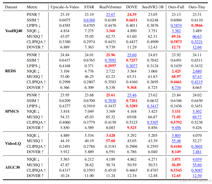- 测试数据集:在YouHQ40, REDS, SPMCS(合成),VideoLQ(真实),AIGC30(AI生成)上评估。