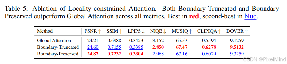 局部性注意力 :在超高清视频上,两种局部性约束变体均显著优于全局注意力,在所有指标上表现更优。值得注意的是,边界截断获得了略高的感知质量,而边界保留则以更好的保真度保持了有竞争力的性能。