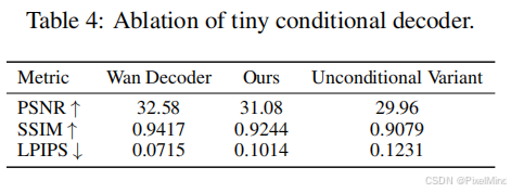 解决方案 :设计一个TC Decoder,输入为Latents和原始LR帧。通过条件约束(也就是LR),简化了重建任务,允许解码器使用更紧凑的模型架构。