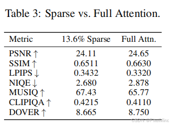 稀疏注意力 :13.6%的稀疏度下,质量几乎与全注意力无异,但速度提升3.1倍。这表明稀疏注意力有效地修剪了冗余的交互,减轻了计算开销,同时保留了高质量视频超分辨率所必需的时空依赖关系。