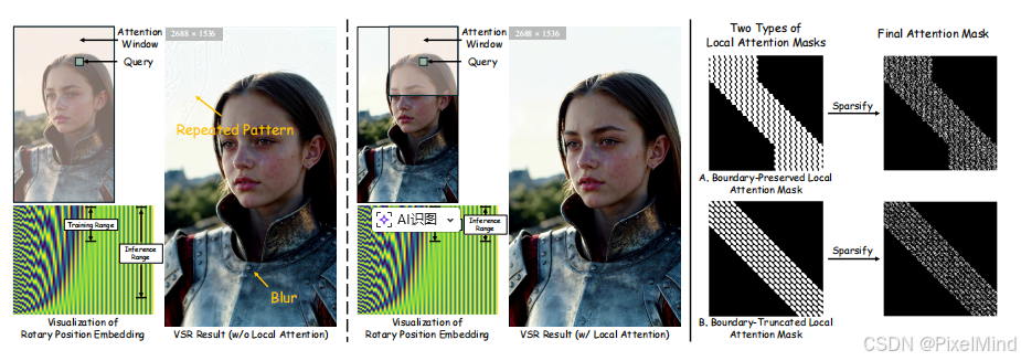 为此,这里引入了局部约束稀疏注意力,在推理时,限制每个Q的注意力范围在一个局部空间窗口内使位置编码范围与训练时保持一致。也提出了两种边界处理方式:Boundary-Preserved 和 Boundary-Truncated。