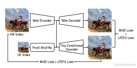 训练方式 :用61帧视频片段(384x384)单独训练,结合像素级监督和从原始Wan解码器蒸馏的损失。