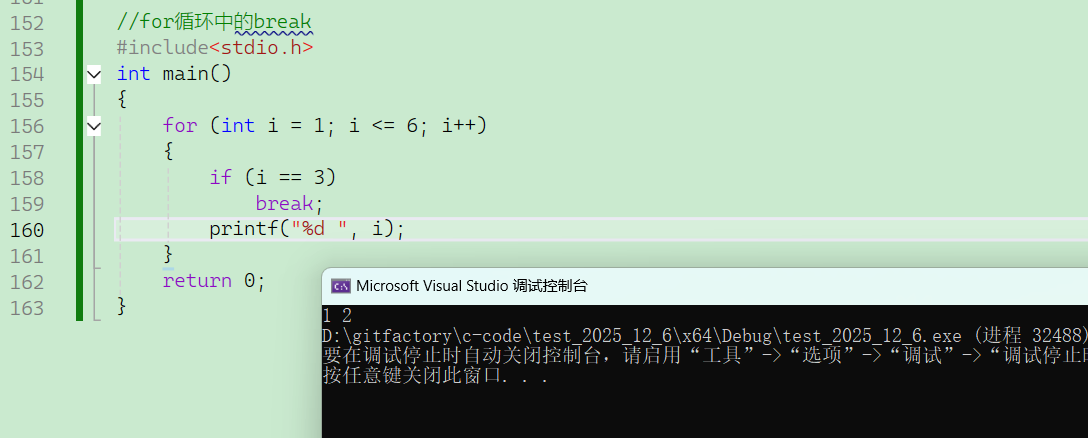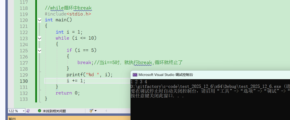 上述代码打印了1 2 3 4后,当i==5时,循环执行break语句,循环结束,跳出循环。