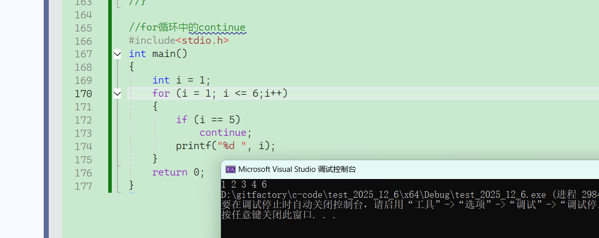 对于for循环中的continue语句,continue语句作用是跳过本次循环后的代码,直接去到循环的调整部分。(这是与while中的continue语句的区别)