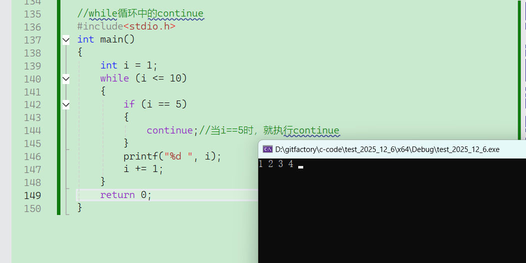 执行上述代码时,虽然结果输出了1 2 3 4,但是代码一直陷入了死循环的状态,这是因为:i==5时,就执行continue,直接跳过了continue之后的代码,而直接去执行while后边的代码:i<=10;因为此时i==5,所以去执行i<=10时,始终是真的结果,所以这就是为什么代码会陷入死循环状态的原因。