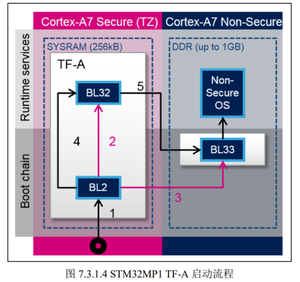 图 7.3.1.4 中 TF-A 启动分了 5 步,这 5 步的含义如下: