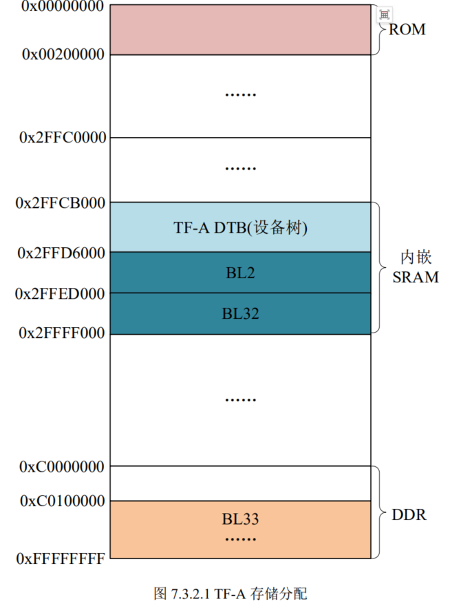 图 7.3.2.1 中 TF-A 各部分存储映射不是固定的,编译 TF-A 的时候配置不同,其存储地址也不同。比如图 7.3.2.1 中 BL32 的起始地址为 0x2FFED000,大家在看其他资料的时候可能是别的地址,这个没关系的,重点是其存储映射形式。