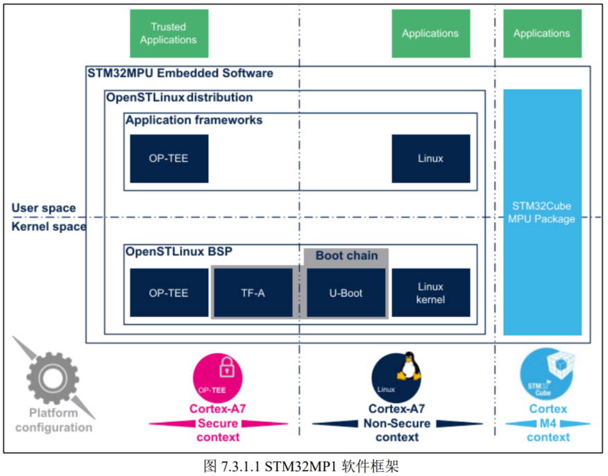 STM32MP1 支持 TrustZone,所以 ST 提供的软件包包含了安全固件。相比传统 ARM 处理器(如 ARM9,ARM11 等)最常见的 uboot 和 linux kernel,STM32MP1 的软件包还另外提供了TF-A、OP-TEE 等安全相关的关键软件,因此 STM32MP1 的整体软件框架必然和传统的 ARM芯片不同,STM32MP1 软件架构如图 7.3.1.1 所示: