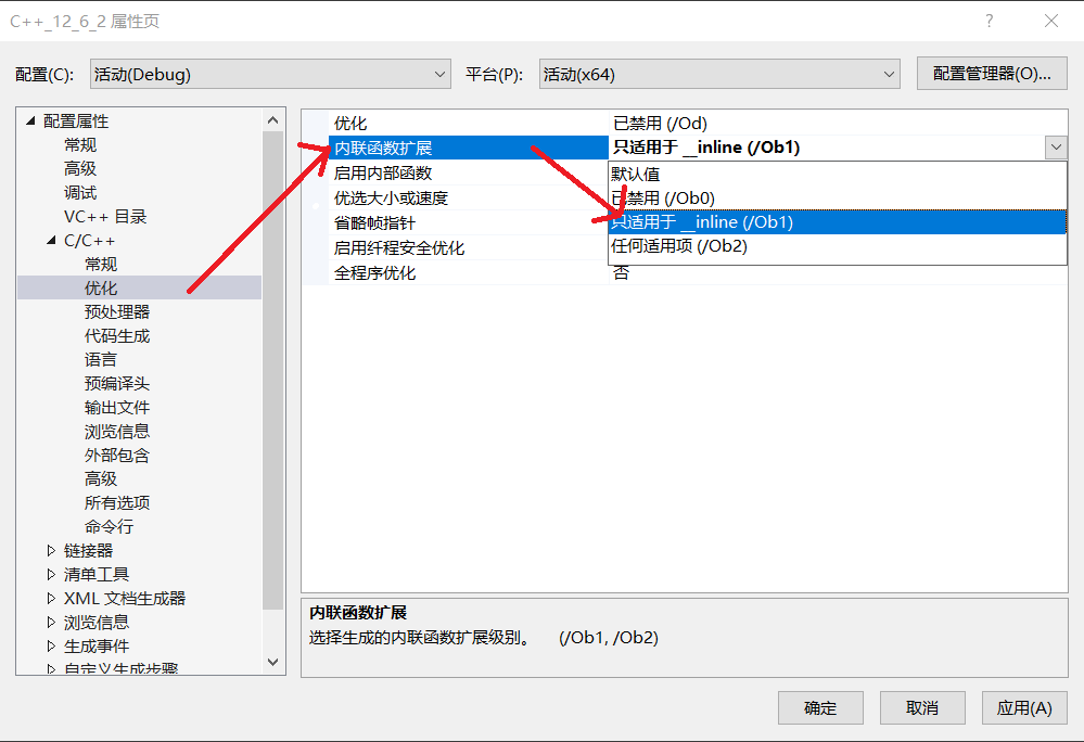- vs编译器debug版本下⾯默认是不展开inline的,这样⽅便调试,debug版本想展开需要设置⼀下 以下两个地⽅。