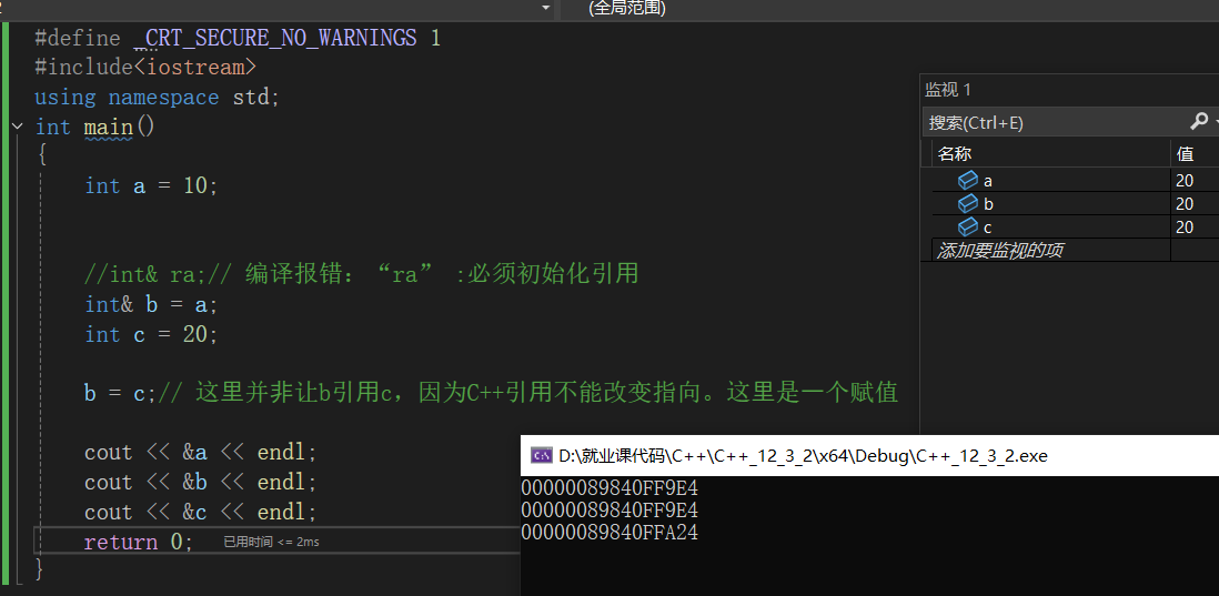 引⽤在定义时必须初始化,指针建议初始化,但是语法上不是必须的。