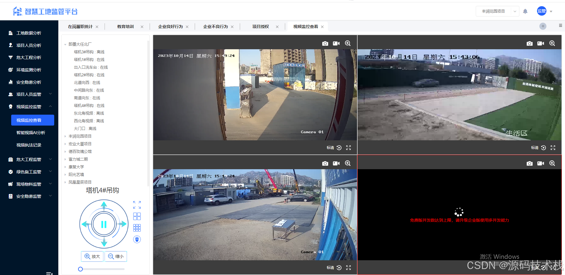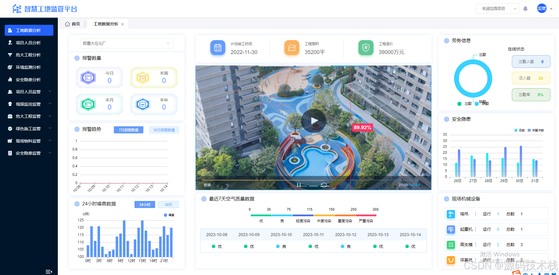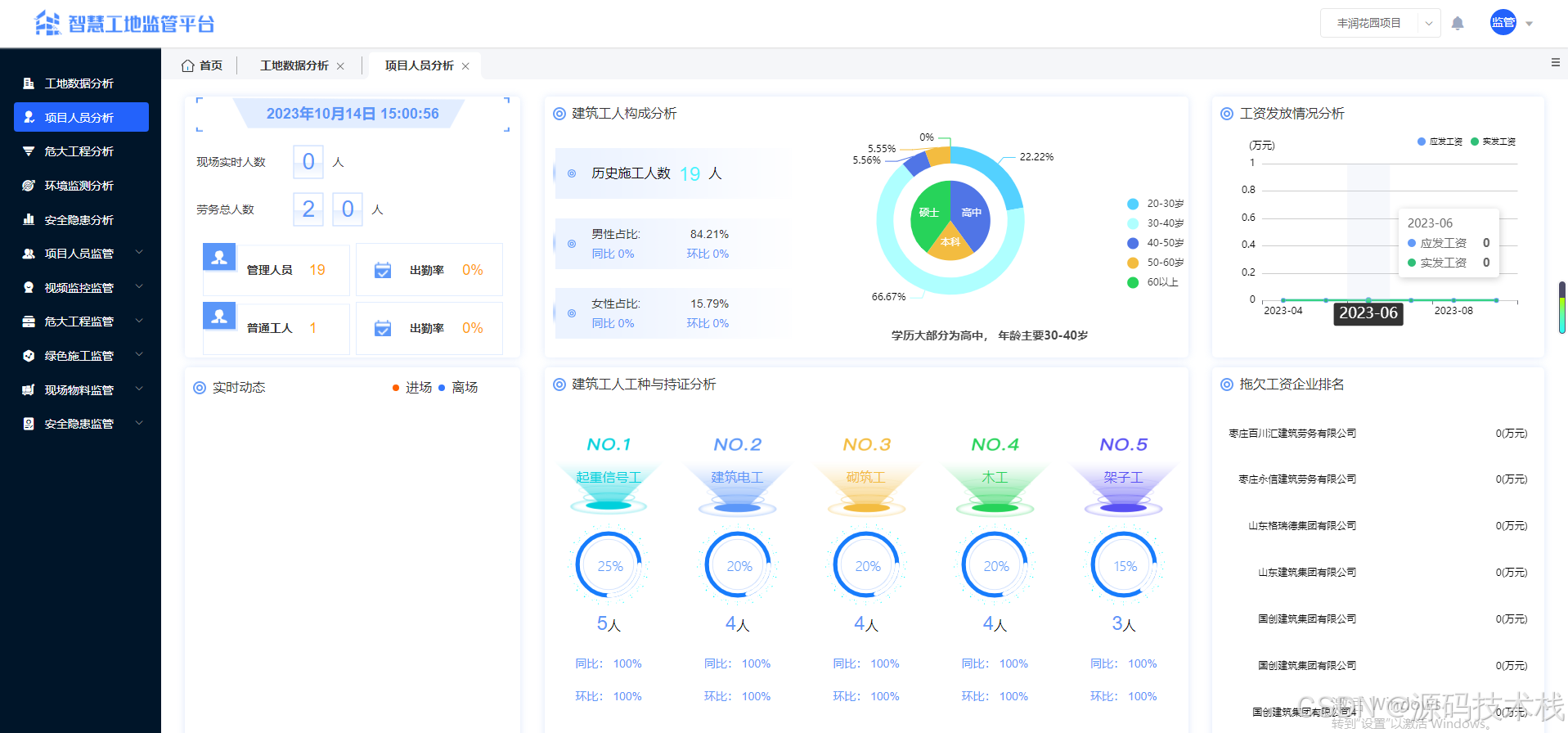 考勤管理:支持安全帽,手机端等多种打卡方式,对人员进出场时间记录、工时统计;分区管理、考勤记录、工资发放。