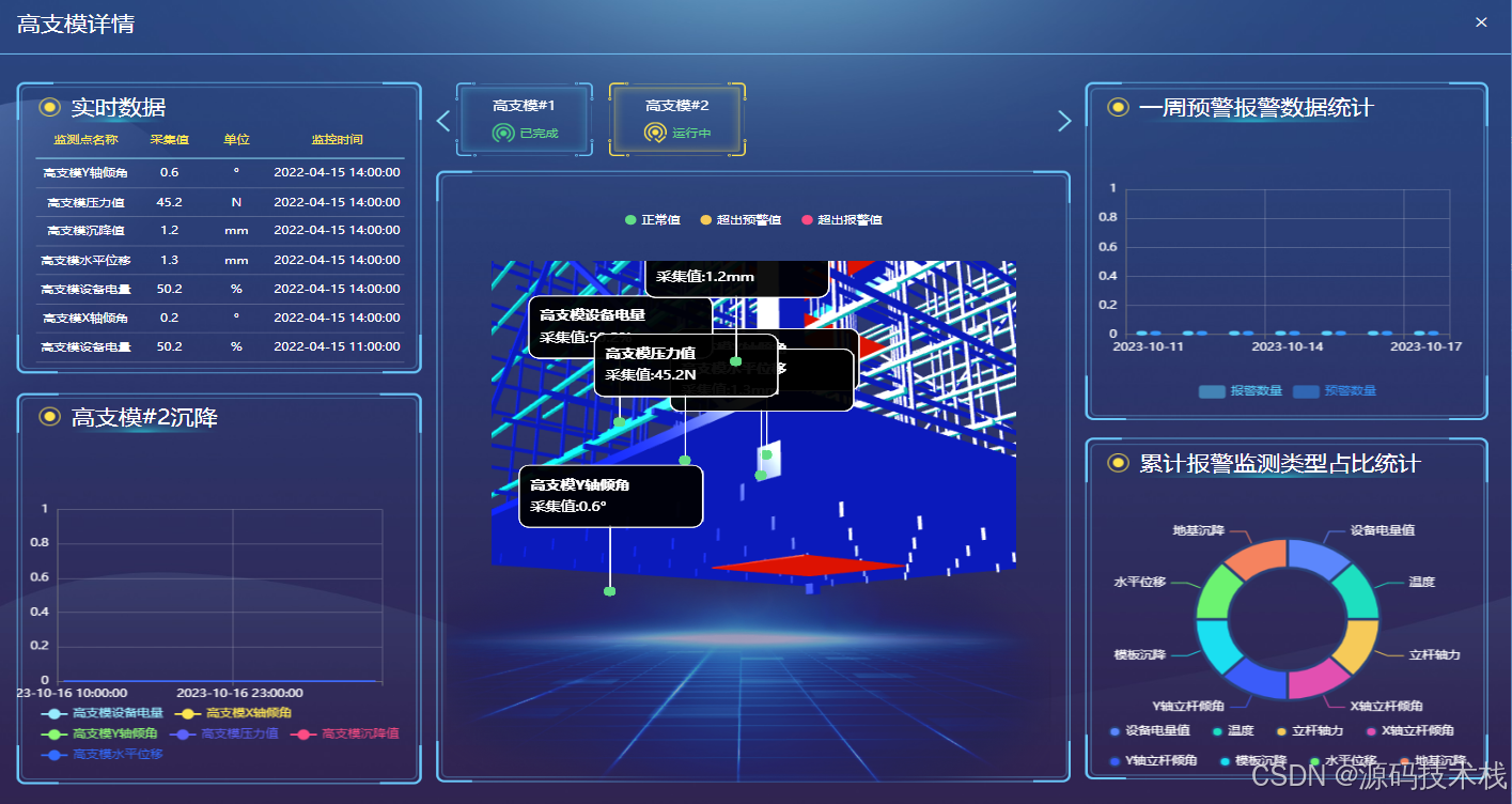 实时监测高支模立杆及倾斜角度、荷载,监测架体的水平位移以及模板沉降情况;当检测数据超过预警值时,实时报警并发送云平台。