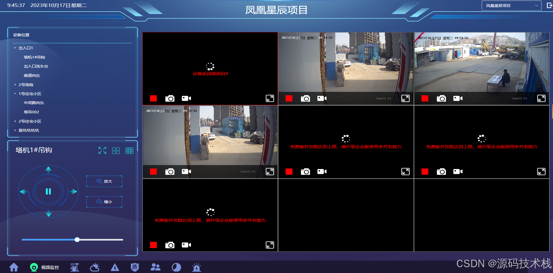 能够对重要运行参数进行实时监视,包含重量、力矩、高度、幅度、回转角度、运行速度、风速;当塔机出现危险操作时,实时报警数据将推送至智慧工地平台。