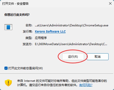 - 双击下载的 ChromeSetup.exe,如果弹出安全警告窗口,点击"运行"即可: