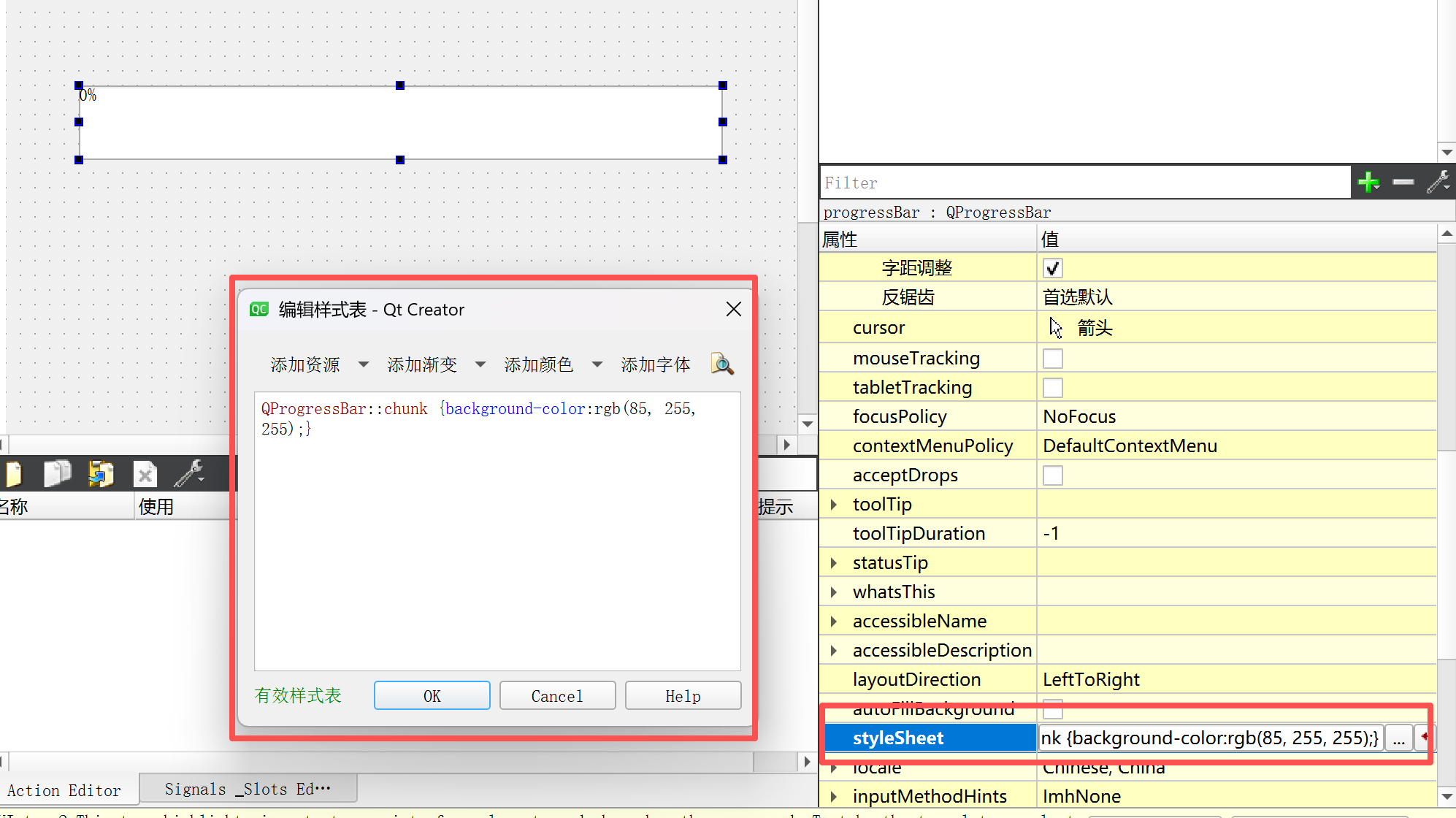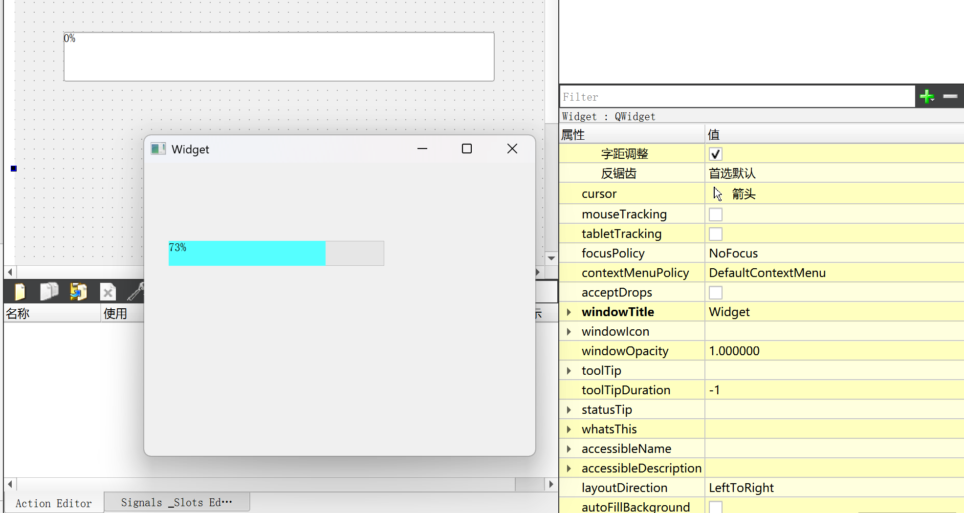 | alignment | 文本在进度条中的对齐方式:Qt::AlignLeft : 左对齐;Qt::AlignRight : 右对齐;Qt::AlignCenter : 居中对齐;Qt::AlignJustify : 两端对齐; |