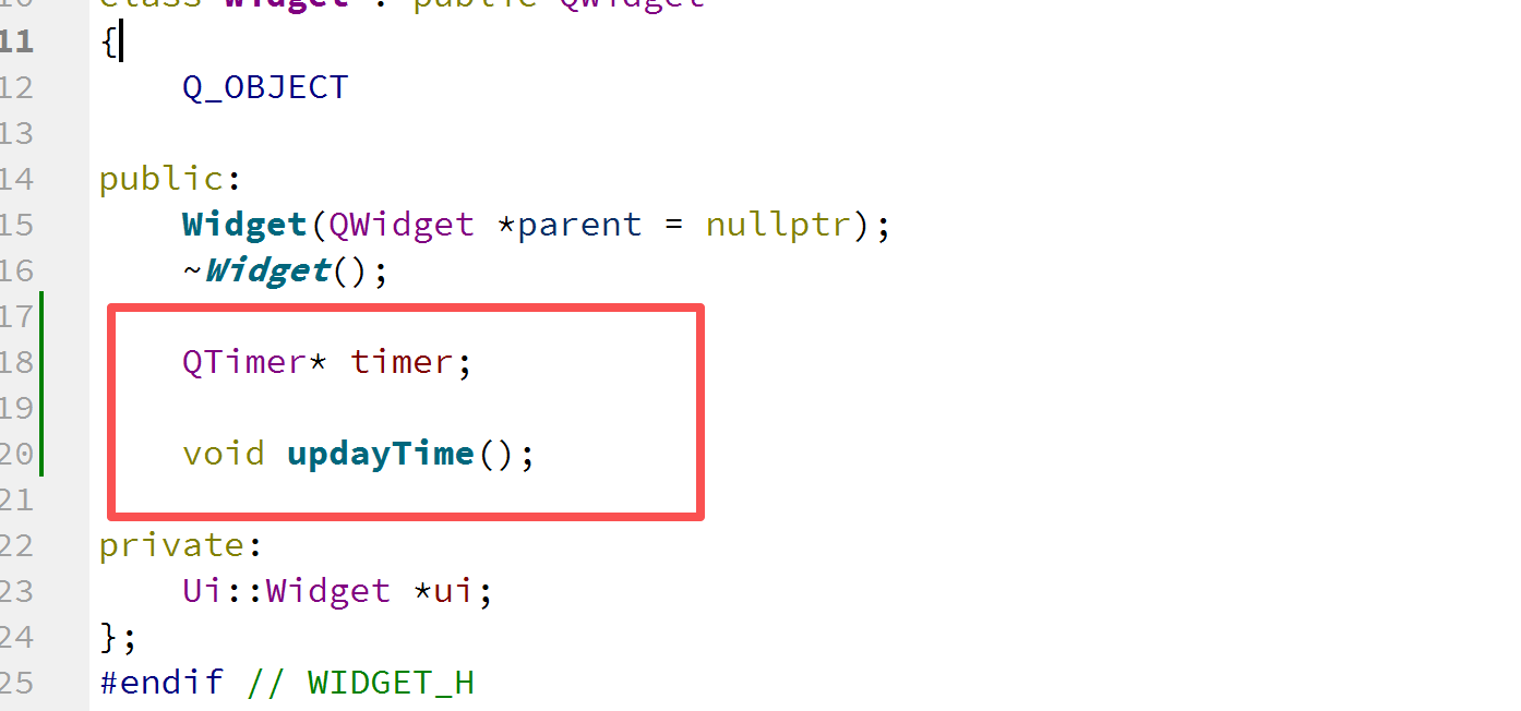 在widget.h中添加一个QTimer成员和一个updayTime函数