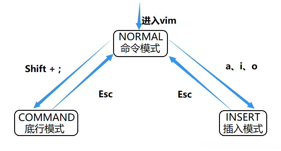 我们这里主要介绍vim最常用的三种模式:命令模式、插入模式、底行模式。