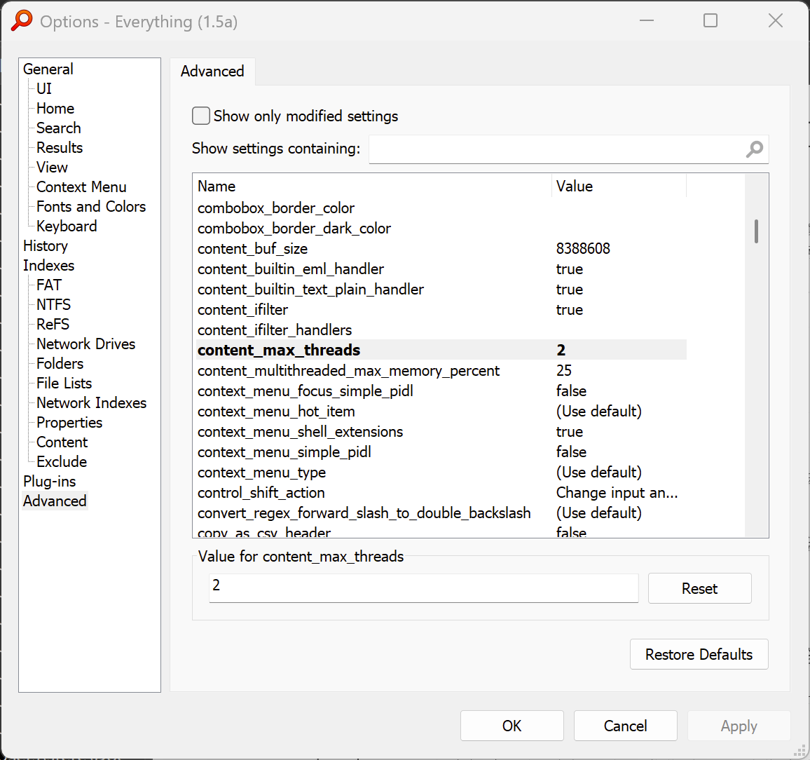 Tools → Options → Indexes → Advanced → Content indexing thread count