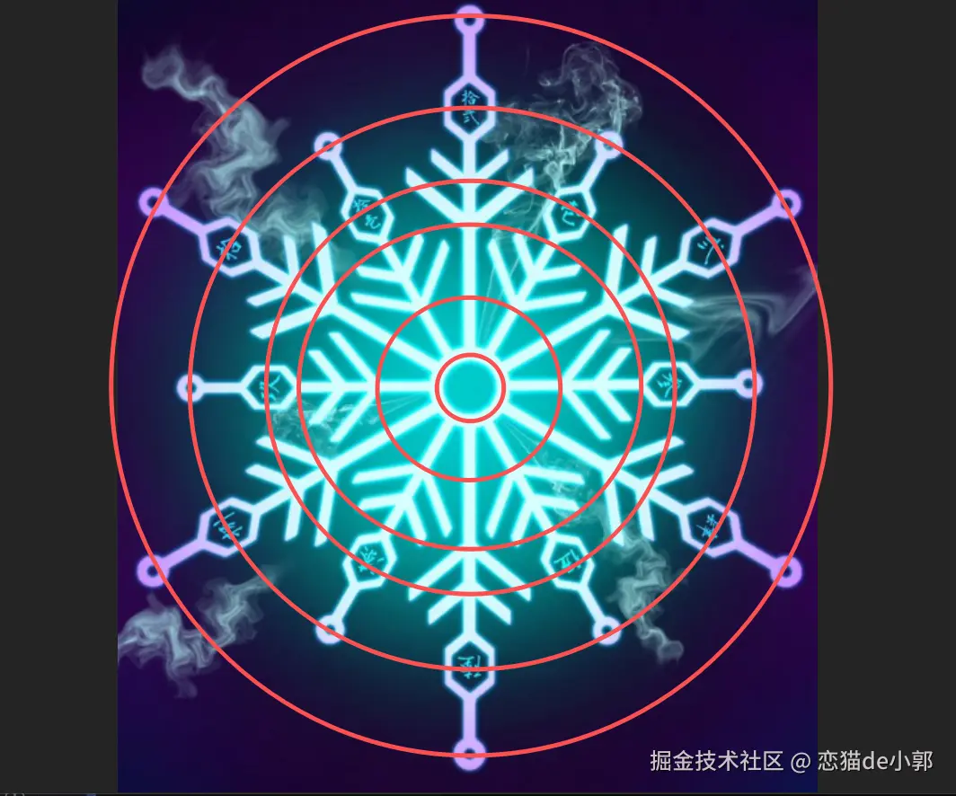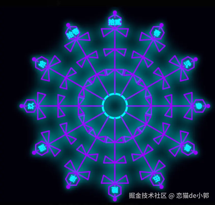 因为我提供了阵法的圆周对称的示例,所以整个绘制逻辑都是围绕圆形为基础做布局,其中主要就是以极坐标系为主: