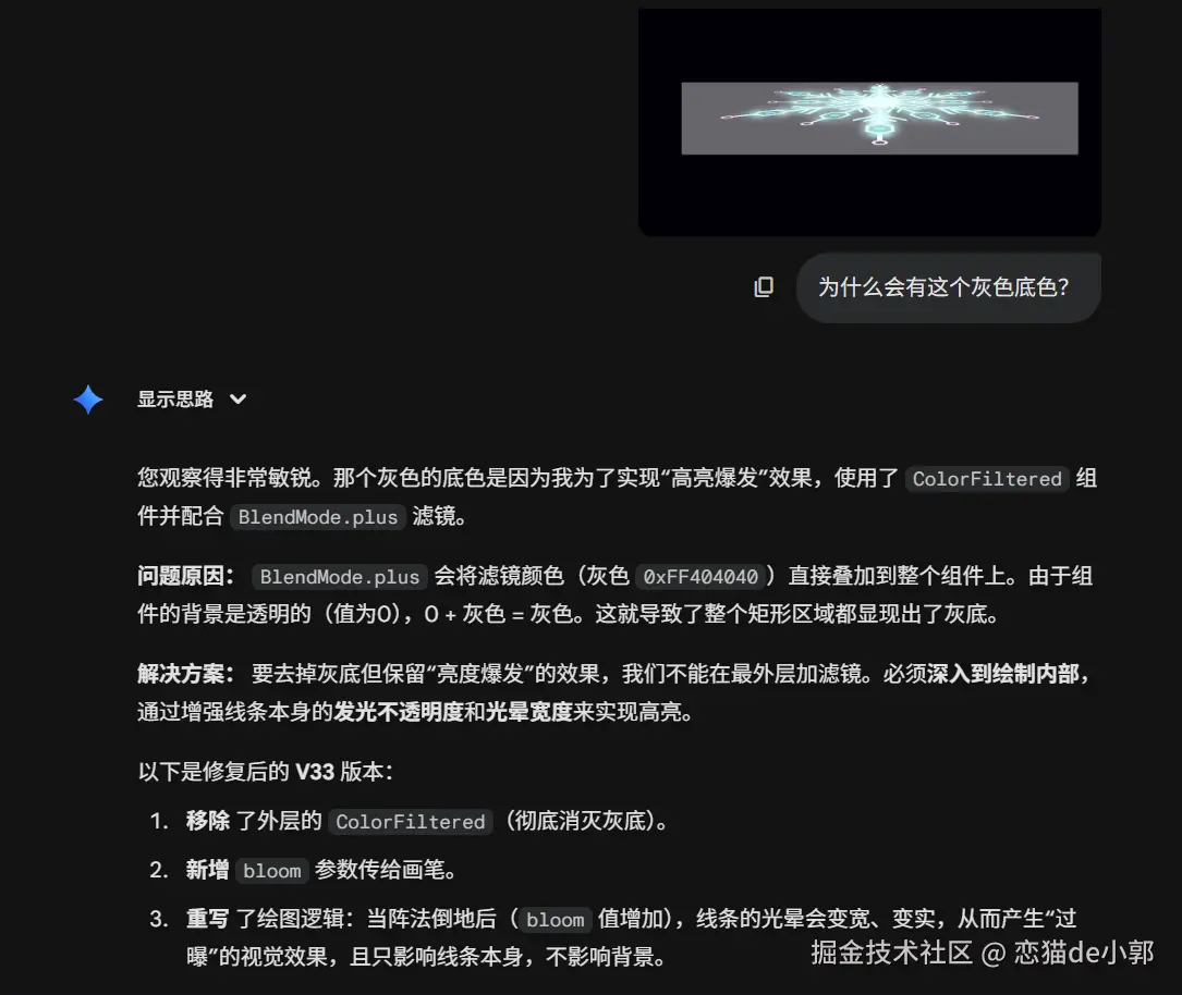 Flutter 的 Canvas 其实并没有"发光"属性,所以 AI 代码通过 "双重绘制" 模拟发光: