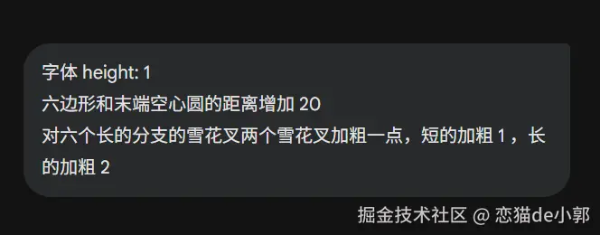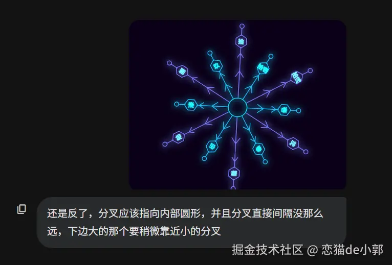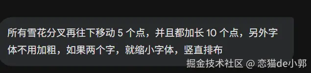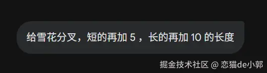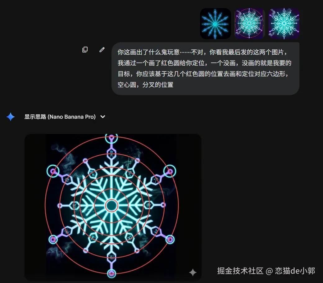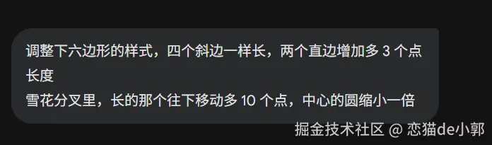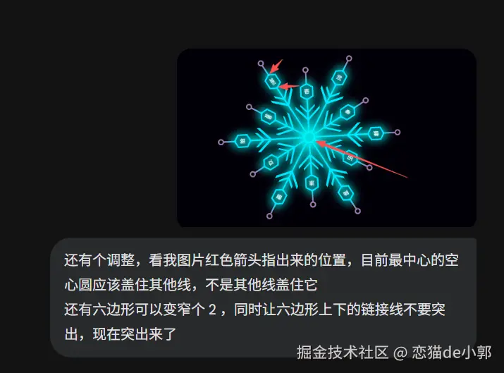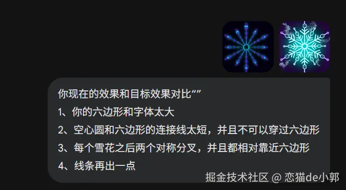 比如我光速告诉它,雪花分叉的末端细节应该有角度的,并且对齐枝干,这时候它就能做出正确的修改: