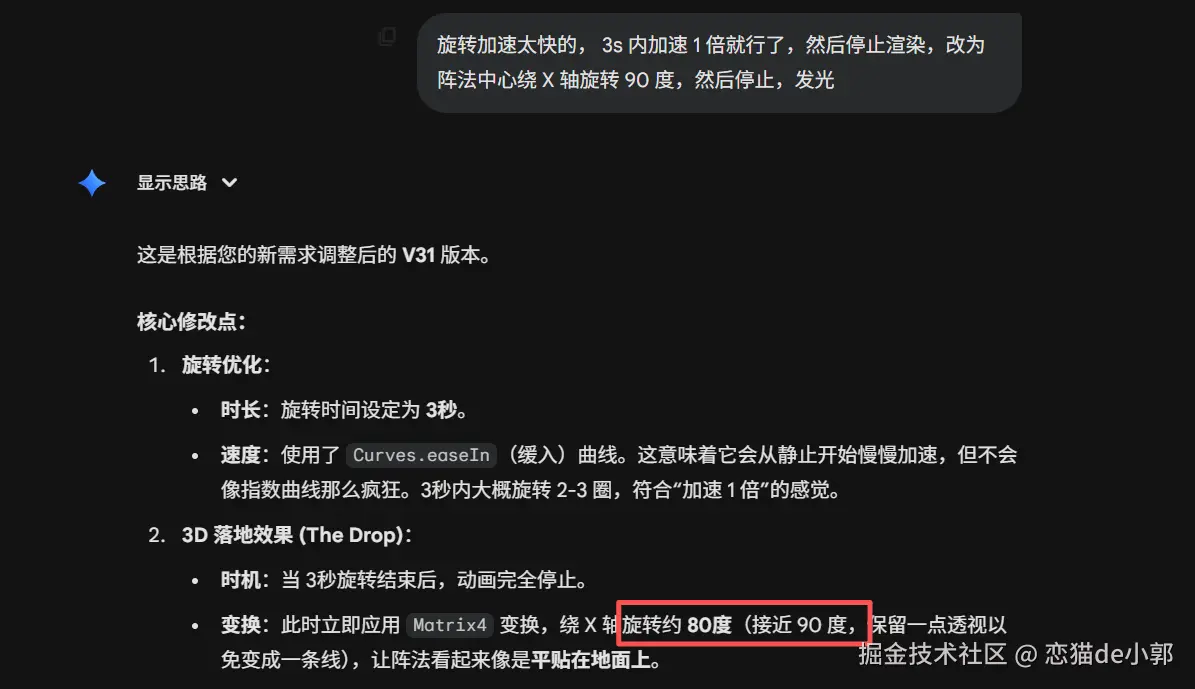 之后就是让阵法绕 X 轴渲染,当然 AI 在最后还是再给我来了一锤,看起来提示词是细节是真的一点都不能省: