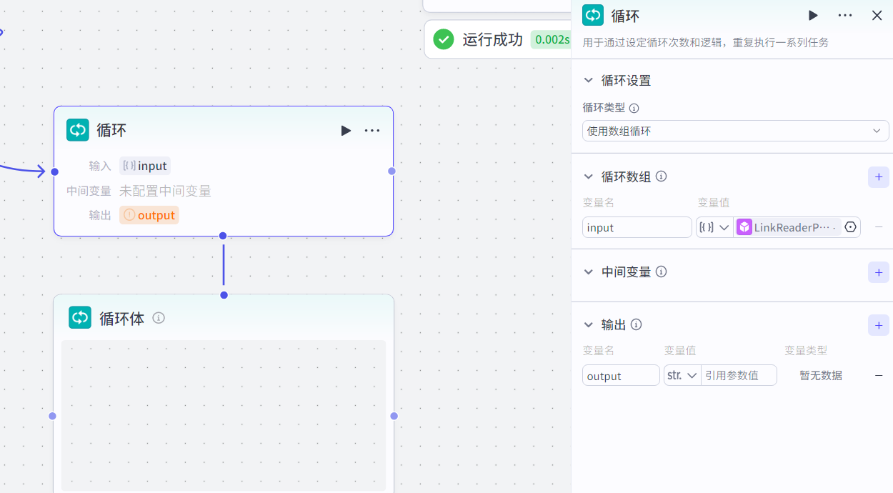 上一步得到了一组数据,接下来就需要通过一个循环节点来对数据进行处理,如下,增加一个循环处理节点