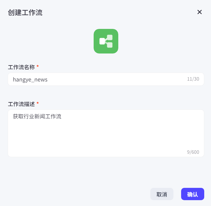 如下,点击创建工作流,在弹窗中填写工作流名称和描述