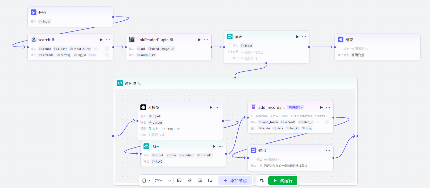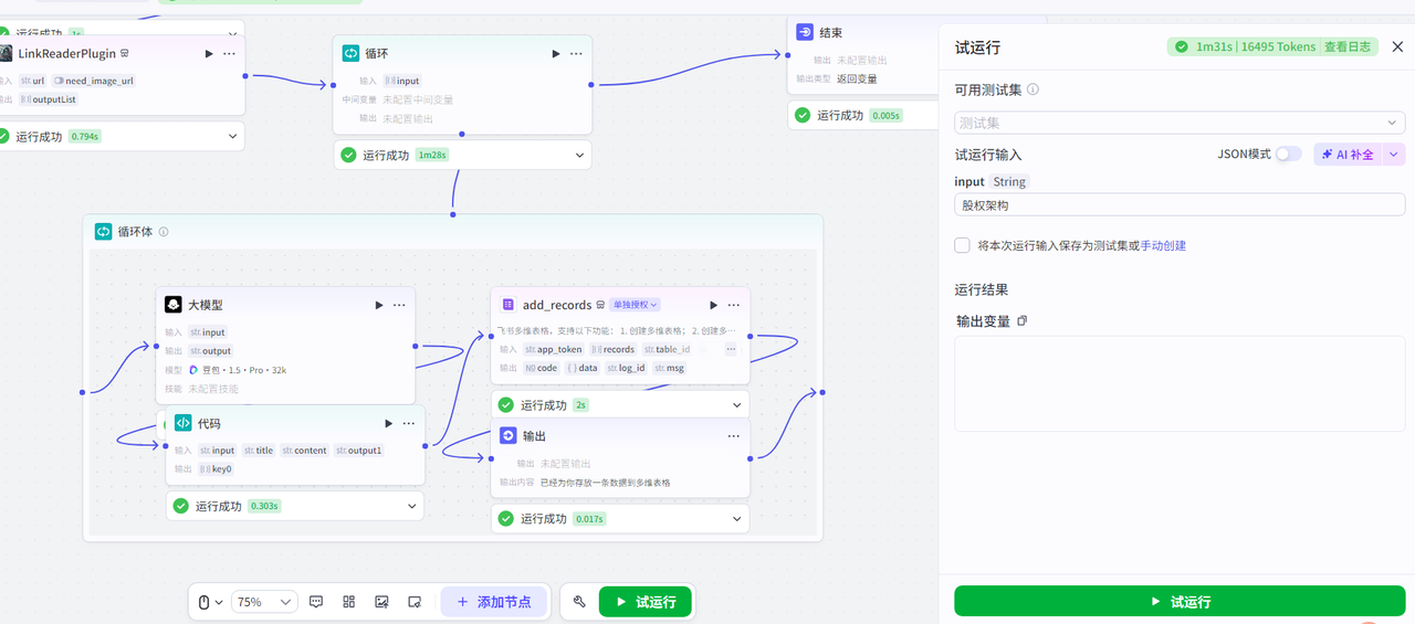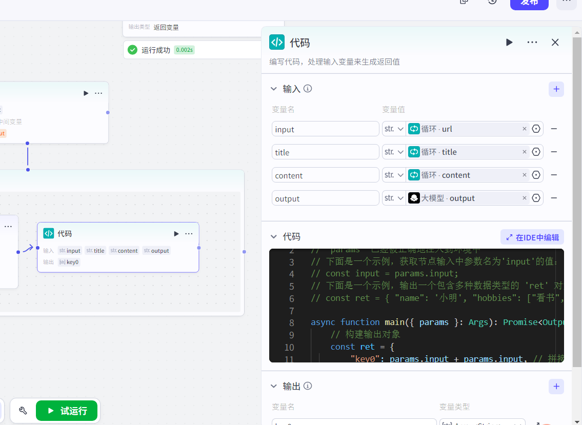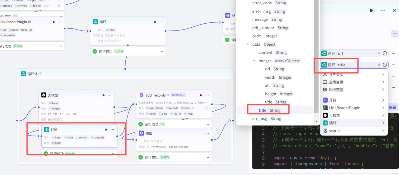 验证发现,还有部分字段没有写入成功,此时还需要返回去对流程中的部分节点进行微调,发现是代码节点中选择的title参数不对,重新做一下调整