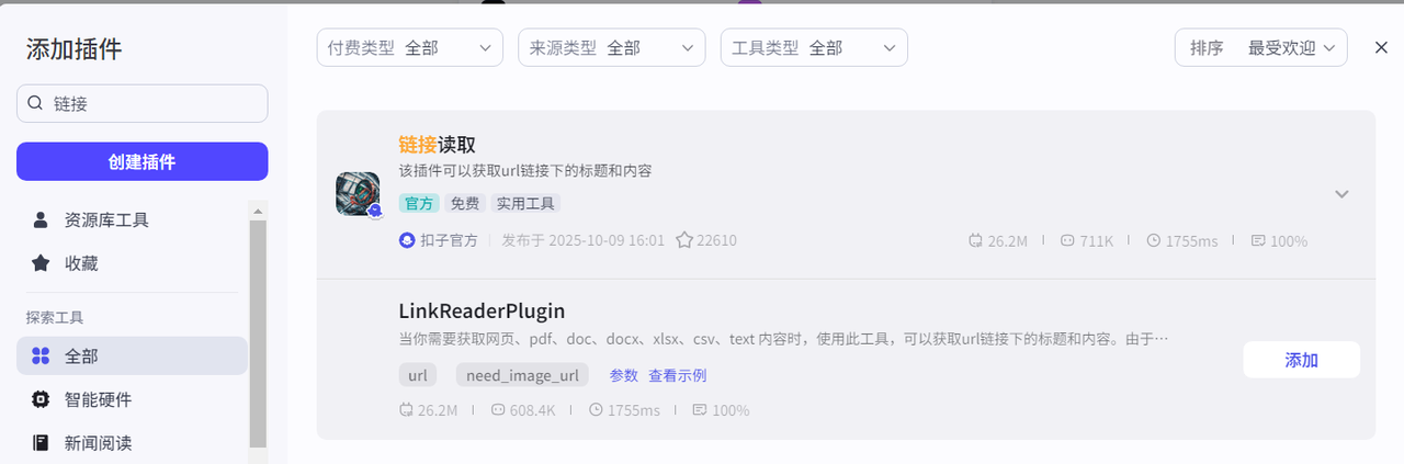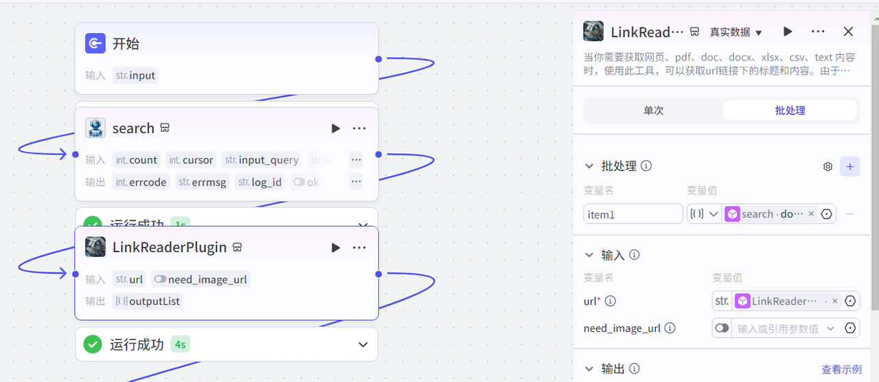 上一个插件节点可以得到搜索结果的信息,返回的结果中有多个字段,我们需要的是里面的url,紧接着增加一个链接提取的插件,如下