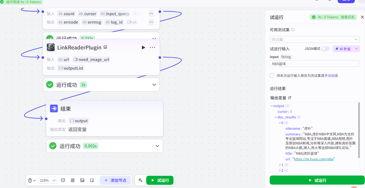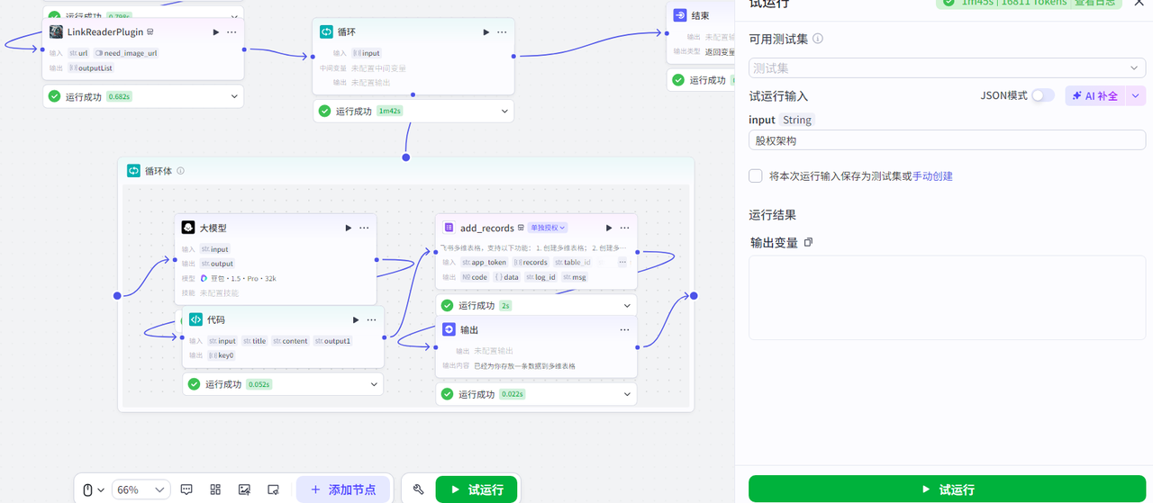 | 标准化流程:固化业务逻辑,确保不同执行者输出结果一致 | 动态调试:实时试运行并查看节点输出,快速定位问题 |