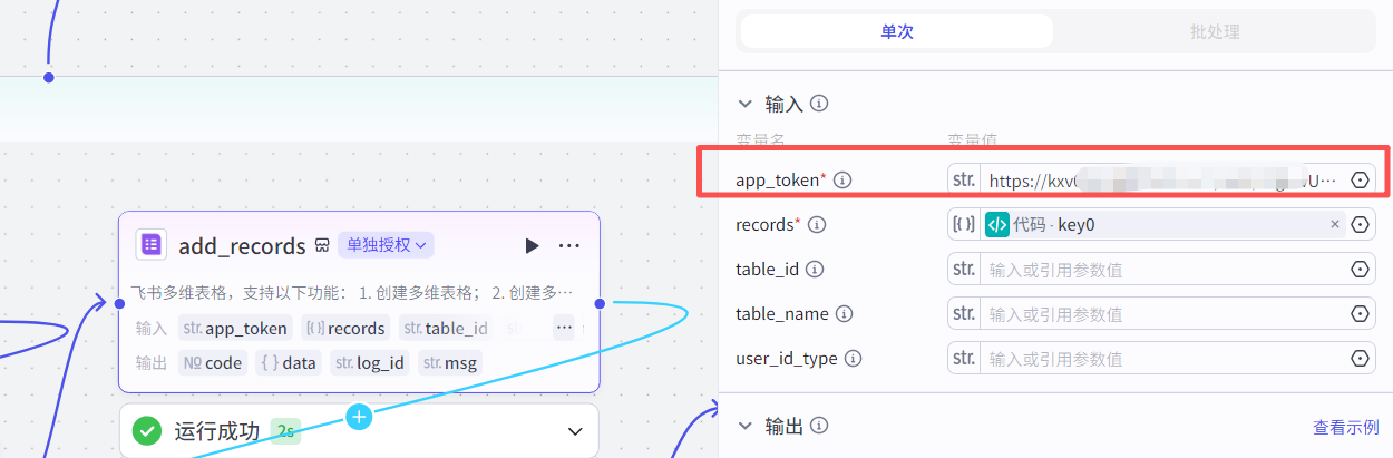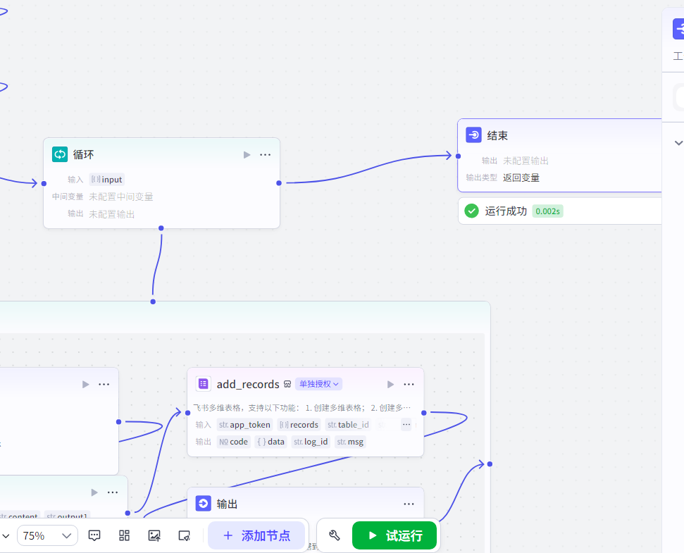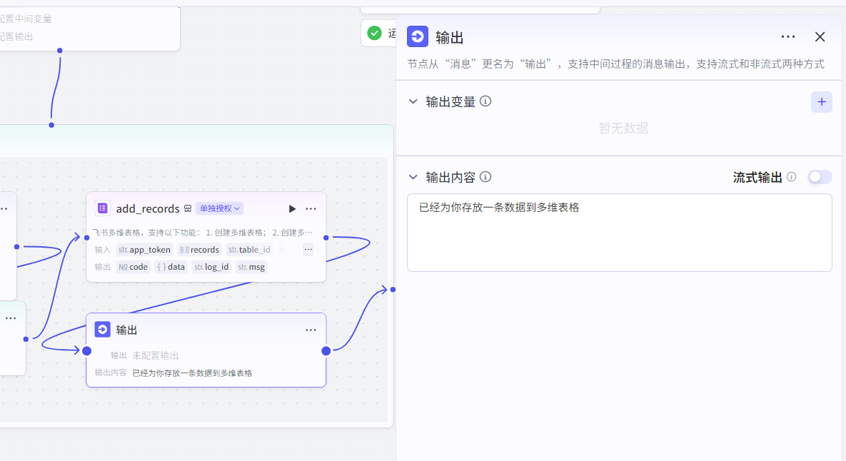 为了方便看效果,在后面紧接着增加一个输出节点,当每次循环的输出内容写到飞书多维表之后,给一个输出提示