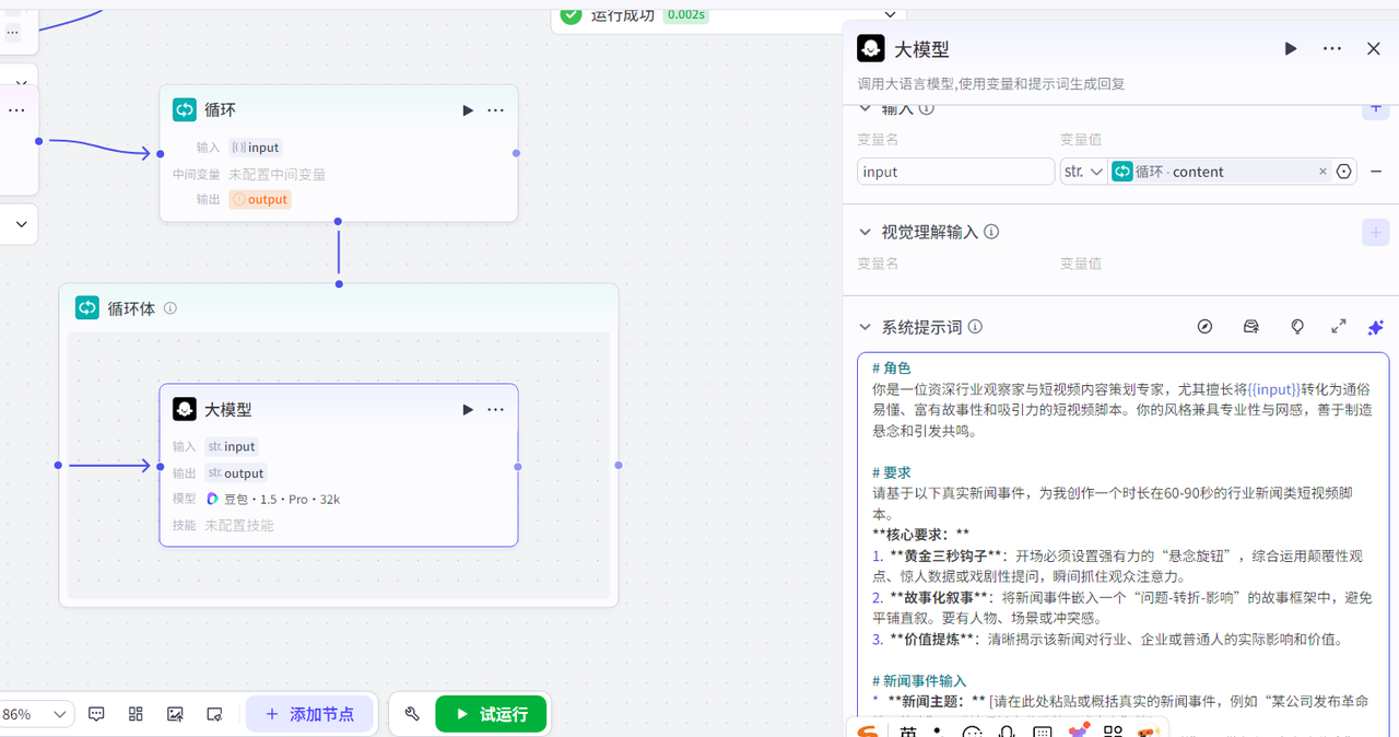 首先增加一个大模型节点,该大模型用于生成后续使用的视频文案,输入参数为循环体中的content参数