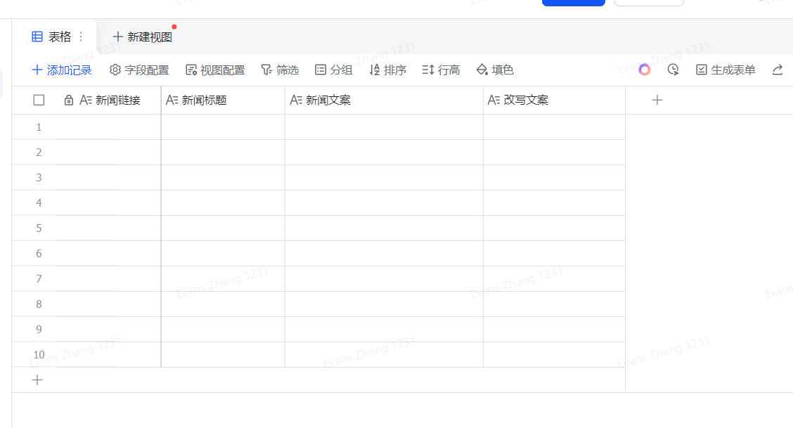 原始的飞书多维表如下,要注意多维表中的字段名称与代码节点中的字段名保持一致