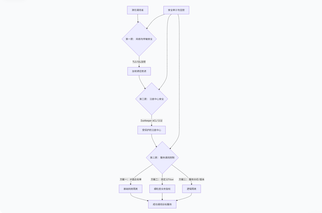 一个完善的生产级Dubbo服务安全体系,不应只依赖单一的ACL机制。如下图所示,它应该是多层次、纵深防御的策略组合:
