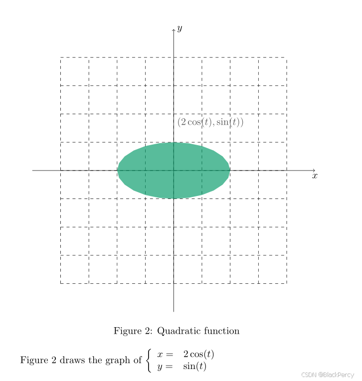 \fill[green!60!blue,opacity=90](0,2)[domain=0:360] plot({cos(\x)*2},{sin(\x)})--(0,2)node[below right, black]{$(2\cos(t),\sin(t))$}; % 绘制二次曲线,起点,定义域,函数解析式,终点