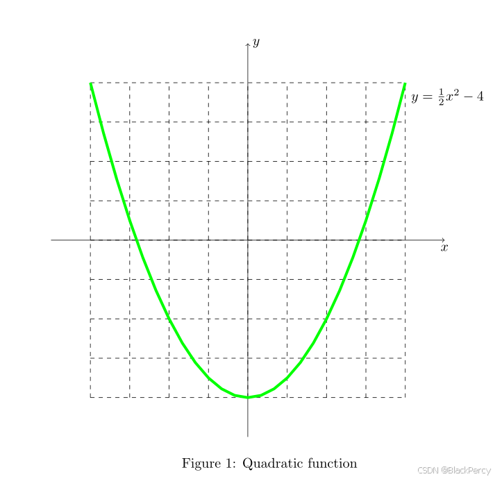 \draw[green,line width=2](-4,4)[domain=-4:4] plot({\x},{\x*\x/2-4})--(4,4)node[below right, black]{$y=\frac{1}{2}x^2-4$}; % 绘制二次曲线,起点,定义域,函数解析式,终点