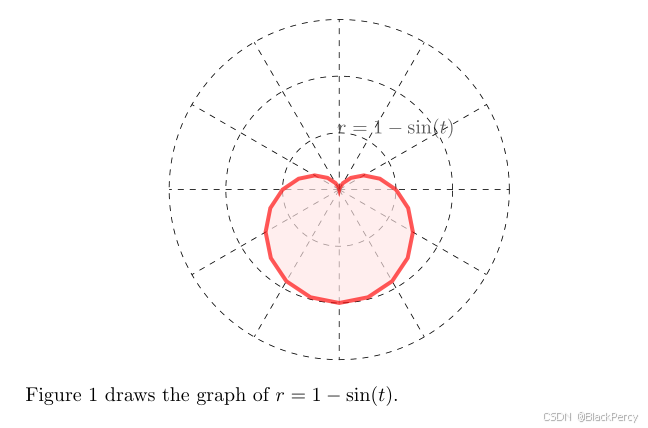 \filldraw[draw=red,fill=red!10,opacity=90,line width=2](0:1)[domain=0:360] plot({\x}:{1-sin(\x)})--(360:1)node[below=-40,]{$r=1-\sin(t)$}; % 绘制二次心形线的曲线与填充,起点,