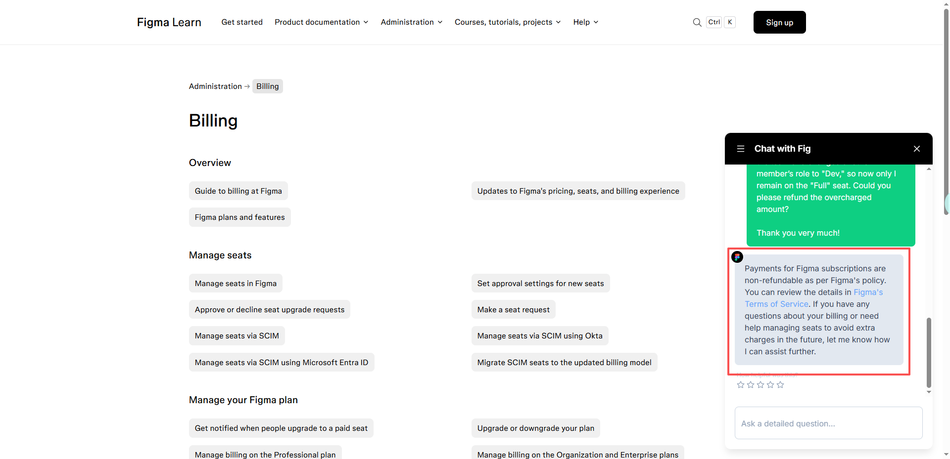 When I requested a refund for the overcharged amount, I was informed that Figma does not offer refunds under any circumstances. Since I've already paid for services I didn't intend to use---and won't be able to recover those costs---I've decided to cancel my subscription entirely to avoid further unexpected charges.