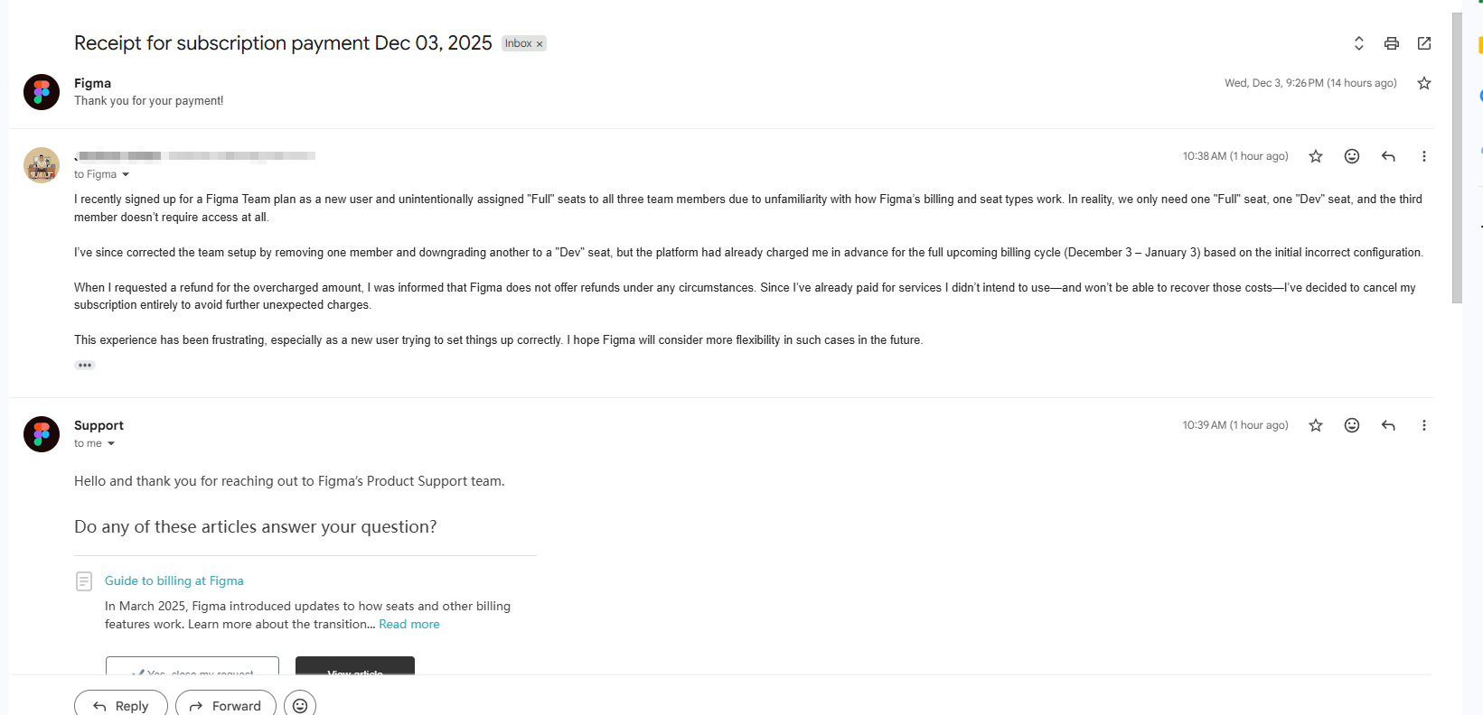 I would like to request a refund. Yesterday, the platform charged me in advance for the upcoming billing cycle (from December 3 to January 3 of next year). As a new Figma user, I wasn't fully aware of how the platform works, which led to all three members of my Figma Team being assigned the "Full" seat type. However, we actually only need one "Full" seat, one "Dev" seat, and the third member doesn't require a seat at all and can be removed from the team entirely.
