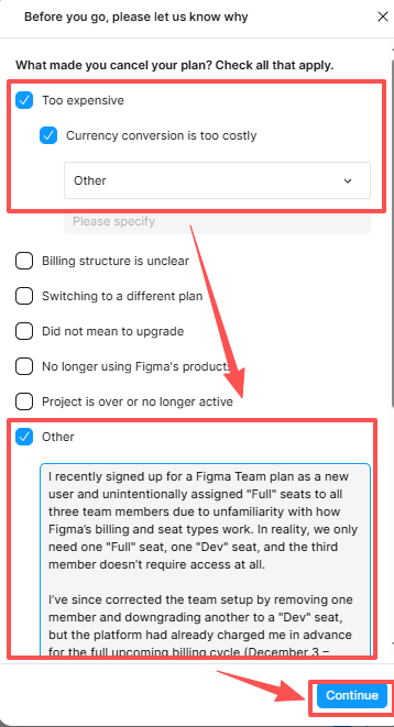 I recently signed up for a Figma Team plan as a new user and unintentionally assigned "Full" seats to all three team members due to unfamiliarity with how Figma's billing and seat types work. In reality, we only need one "Full" seat, one "Dev" seat, and the third member doesn't require access at all.