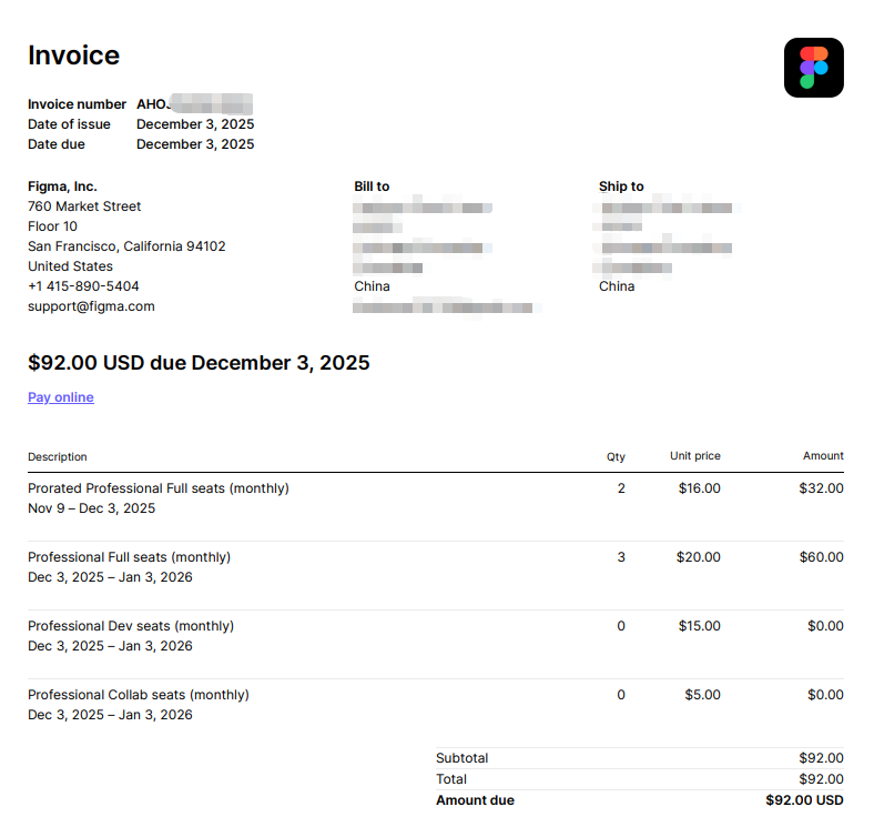 可是我是Figma新手没有注意到一些细节,后续邀请进入的小伙伴全是Full角色,所以就导致203=60美元的预付,上个月不是完整的月份按照比率折算的两个席位162=32美元。