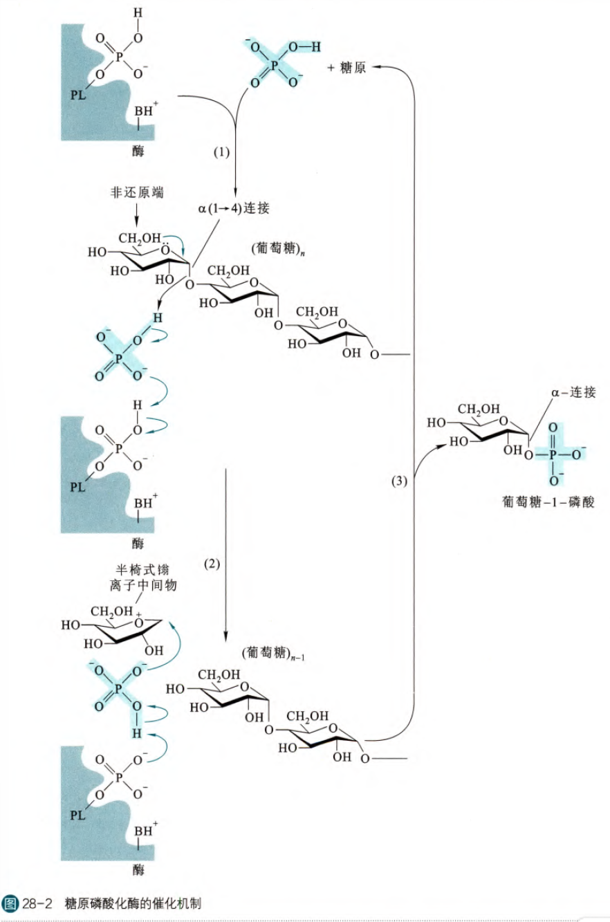 整个反应可以分为两步,一步是磷酸基团介导的葡萄糖残基的脱落并形成半椅式鎓离子中间物,第二步是磷酸基团与中间物的结合形成G-1-P,同时酶上的磷酸基团也恢复与原态,这里的酶实际上发挥的是广义的酸催化,与亲电进攻无关。这整个反应的发生水分子都被完全排除在活性中心之外,有效地防止水解反应的发生。