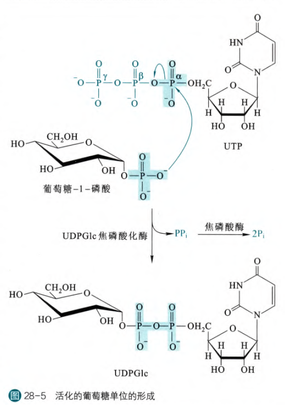 葡萄糖需要活化,葡萄糖分子不可以直接缩合在一起,而是需要活化为UDP-葡萄糖(UDPGlc)才可以发生合成