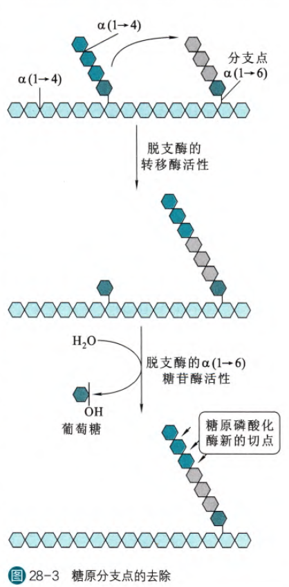 遗留在分支点的葡萄糖残基在脱支酶的第二个功能即α(1->6)糖苷酶的活性作用下,被水解成游离的葡萄糖分子(在这个意义上,肌糖原是可以通过脱支酶产生微量的游离葡萄糖分子)