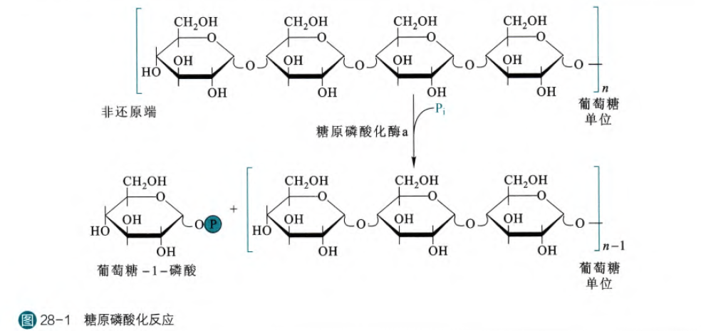 糖原的磷酸解是由糖原磷酸化酶催化的,被磷酸解的葡萄糖残基总是位于非还原端,糖原磷酸化反应在胞内是自发的(因为磷酸的浓度很高)总的来说,磷酸解和水解的差别其实就在于用磷酸基团代替了水分子,离去的葡萄糖残基结合脱质子的磷酸(类比氢氧根),糖原链新的非还原端连接质子