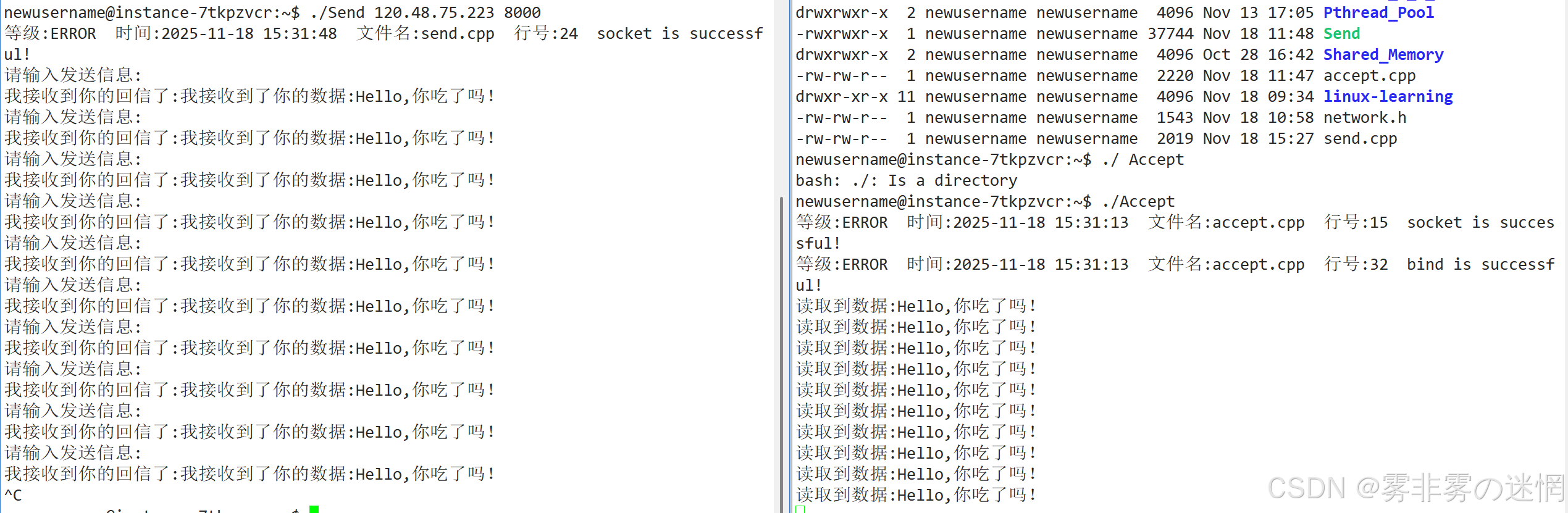 现在我们同时运行客户端和服务端,同时打开云服务端口(或者直接采用别的任意IP)开始通信: